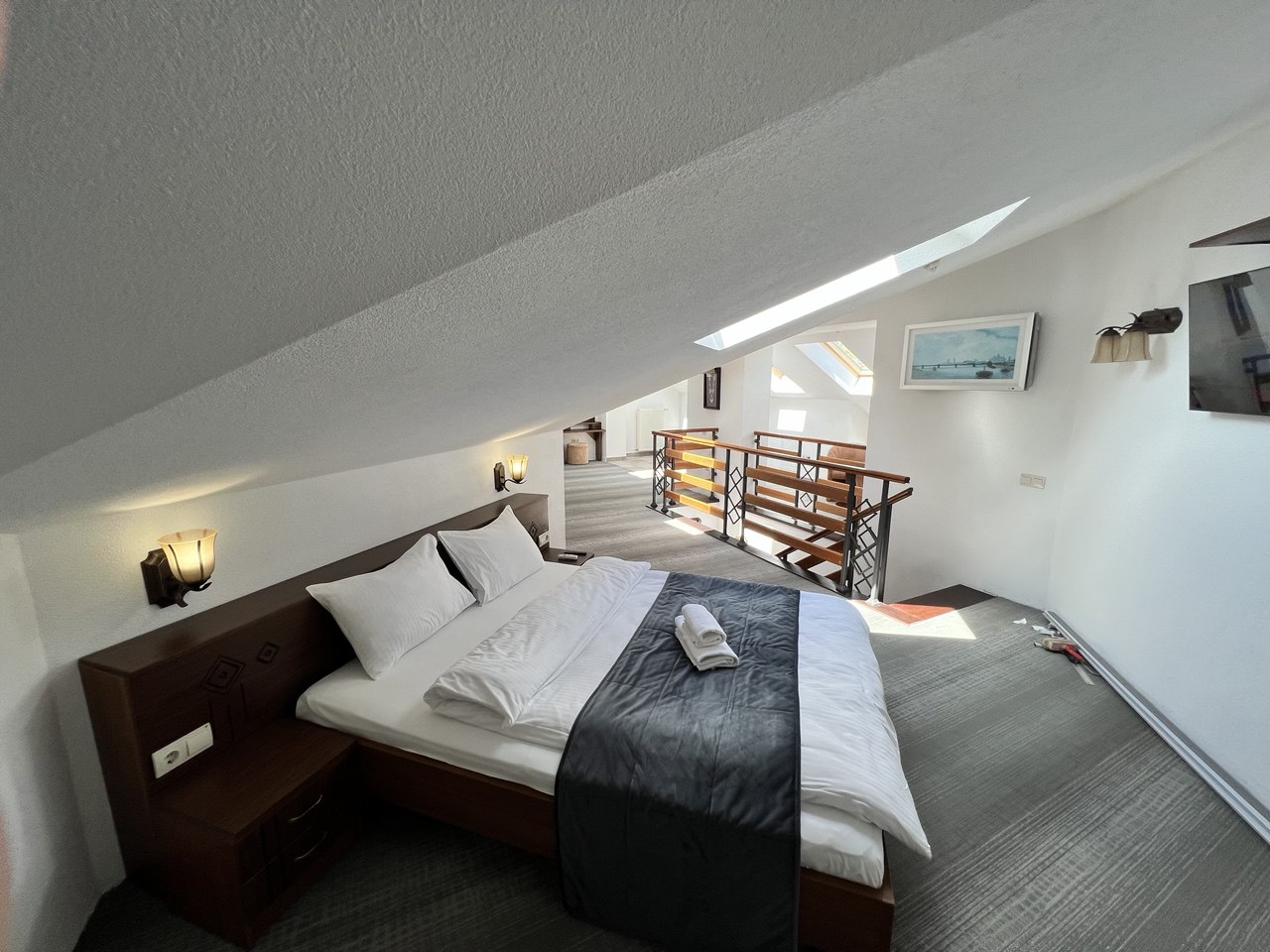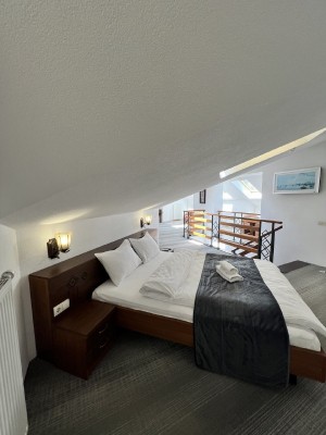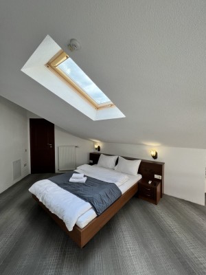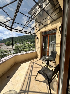 Пропонуємо готельний номер загальною площею 90,4 кв.м на четвертому поверсі з виглядом на гори та річку Прут. На першому рівні - велика вітальня з каміном та відкритою теорасою, на другому рівні - спальня, просторий санвузол з ванною.