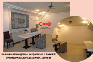 Продается нежилое помещение, встроенное в 1 этаж 5 этажного жилого дома о.пл. 160кв.м., на два входа, стильный ремонт, просторных 4 зала, кабинет, кухня, три с/узла, душевая, подсобное помещение.