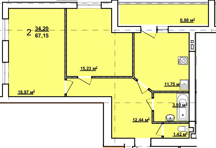 Житлова - 34 м²;