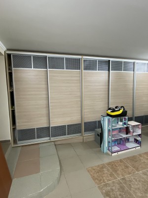 Велика гардеробна кімнатна з вмонтованими, вмісткими шафами.