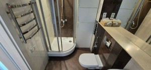 Санвузол суміщений з ванною та душовою кабіною.