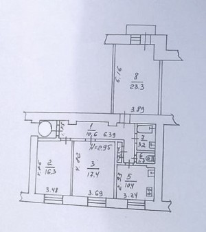 Загальна площа - 84,3 кв.м: ізольована кухня - 10,4 кв.м, три ізольовані кімнати, роздільний санвузол, балкон (виходе у двір).